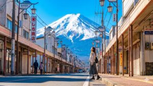 まず向かったのは、SNSでも超有名な「本町通り(ほんちょうどおり)」。 みんなも写真で見たことあるかもしれないけど、実物はね、もう100倍すごいよ! レトロな商店街の看板や電柱が並ぶその道の突き当たりに、ドーーーン!!って富士山がそびえ立ってるの。 「え、これ壁紙じゃないよね?」って二度見、三度見しちゃった(笑)。
