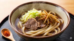 スープは味噌と醤油が絶妙にブレンドされた優しい味。そこに「すりだね」っていう、赤唐辛子や胡麻を合わせた特製の調味料を少し入れると、味がガラッと変わって刺激的に! トッピングの馬肉も甘辛く煮込まれていて、うどんの力強さに負けない存在感。 「顎が疲れる〜!」なんて笑いながら、夢中で完食しちゃった。 お腹の中からエネルギーがみなぎってくる感じ。富士山の伏流水で作られたこのうどんは、まさに「食べるパワースポット」だね!😋