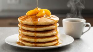 ボウルで粉を混ぜる「カチャカチャ」っていう音、なんだか心が落ち着くよね。フライパンにバターを溶かすと、家中が甘くて香ばしい幸せな匂いでいっぱいに!1枚、2枚、3枚……。どんどん積み上げていくよ! トッピングには、缶詰の桃と、お気に入りのメイプルシロップをこれでもか!っていうくらいドバドバかけちゃう。