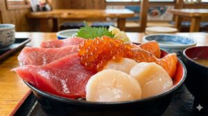 運ばれてきた丼を見て、もう目が釘付け! ツヤツヤに輝くマグロ、透き通ったヒラメ、そして身がパンパンに詰まったホタテ! まずはマグロを一口。…んんんん〜っ!!とろける!! 脂が乗ってるのに、後味がすごく上品で、口の中で旨味がジュワ〜っと爆発するの。 「えっ、今まで食べてたお刺身は何だったの!?」って衝撃を受けるレベル。