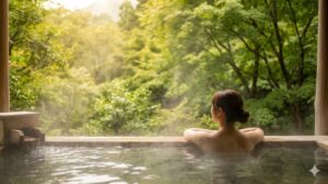 露天風呂に入ると、目の前には箱根の深い森が広がっていて。 お湯に肩まで浸かった瞬間、「ふぁ〜〜〜……」って、全身の力が抜けちゃった(笑)。 都会の満員電車でガチガチになった肩、パソコン作業で疲れ果てた目、そして色々と考えすぎて重くなった心。 全部が、温泉の温かいお湯の中に溶けて消えていく感じ。 「私、今日まで本当によく頑張ったな」って、自分を褒めてあげたくなっちゃう。