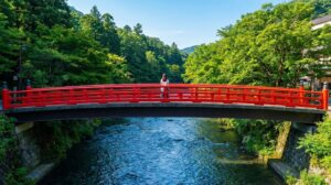 商店街を少し歩くと、早川にかかる真っ赤な「あじさい橋」が見えてくるよ。 ここはね、箱根湯本に来たら絶対に外せないフォトスポット! 鮮やかな赤い橋と、背後にそびえる山の深い緑、そしてキラキラ輝く川の流れ。 「あ、ここ、絶対インスタ映えする!」って確信して、早速自撮り大会スタート(笑)。
