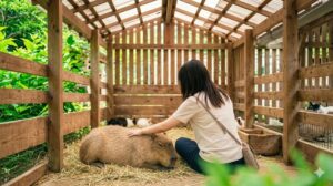 お腹を満たした後は、車を置いて「ふれあいゾーン」へ歩いて移動! ここはサファリゾーンとは違って、小さな動物たちと間近で触れ合える癒やしのパラダイスなんだよ。 まず出迎えてくれたのは、大人気のカピバラさん! お風呂に入っているみたいな、あの「のほほん」とした表情を見ているだけで、こちらの眉間のシワも勝手に消えちゃう(笑)。 そっと背中を撫でてみると、意外と硬い毛の感触に「おぉっ!」って驚いたり。