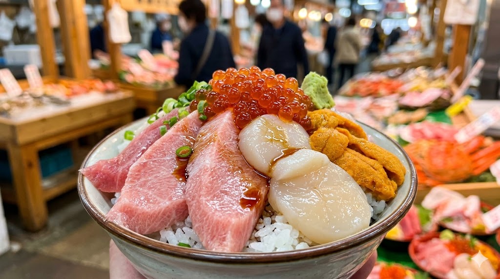 まずは受付でオレンジ色のチケットを購入して、どんぶりに入ったホカホカのご飯をゲット。 そこからが冒険の始まり!「お姉さん、いいマグロあるよ!」「こっちのカニも食べてみて!」って声をかけられるたびに、私の目はキラキラしっぱなし。 大トロ、ホタテ、いくら、ウニ、そして地元の珍しいお魚…。 「これ、チケット何枚ですか?」「1枚だよ!」なんてやり取りをしながら、どんぶりがどんどんカラフルになっていくのが楽しくて仕方ないの!